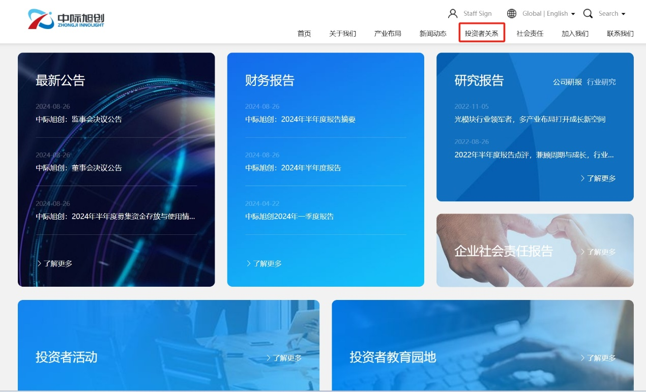 圖為中際旭創(chuàng)官網(wǎng)投資者關系板塊